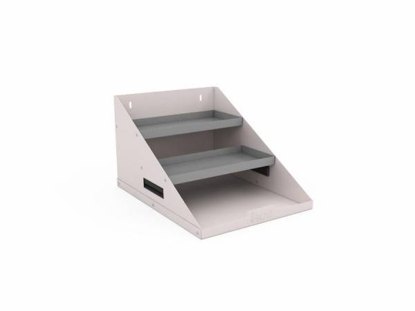 Включает две полки в виде лотков, которые образуют три яруса хранения.