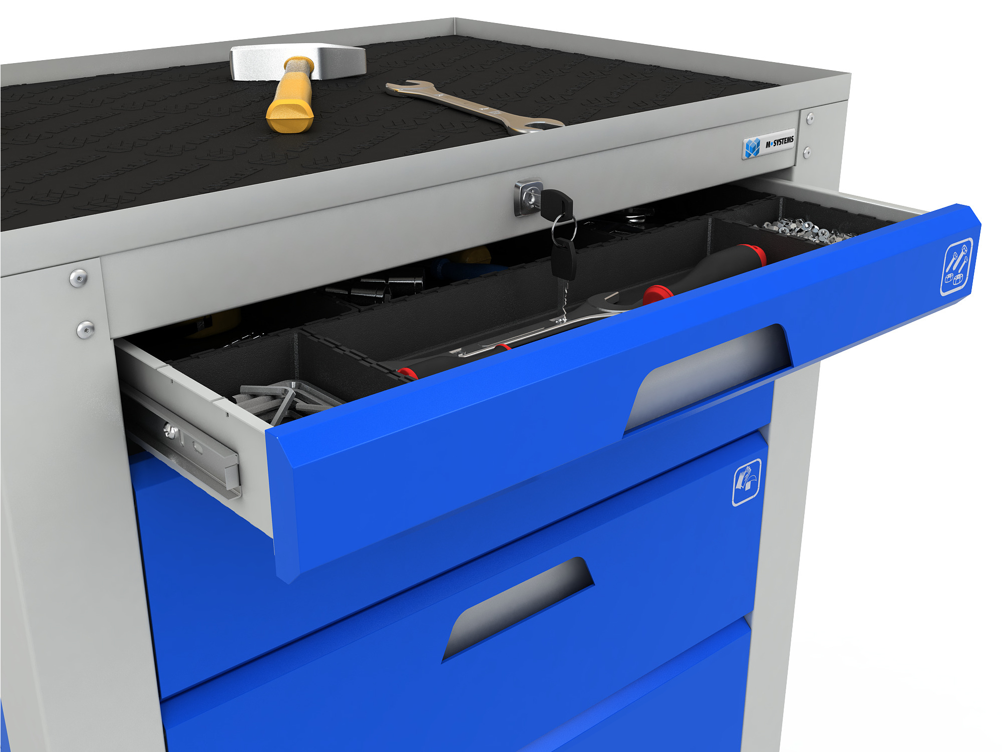 - Лицевые панели ящиков выполнены из цельногнутого стального профиля с отверстием эргономической формы в виде рукоятки