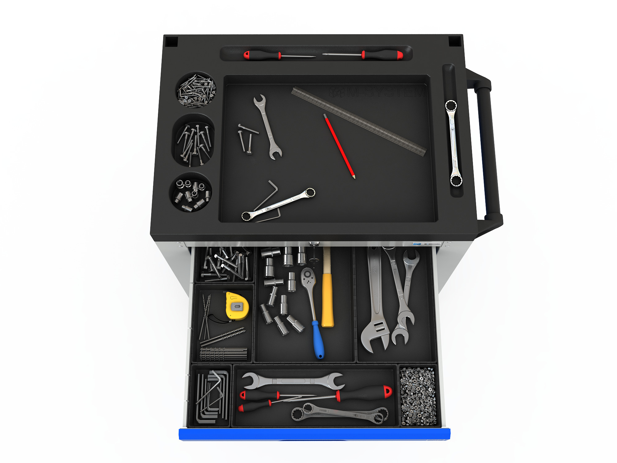- Боковые стенки имеют квадратную перфорацию 9x9 мм с шагом 37 мм для установки держателей и крючков для инструмента и один лоток для хранения различных емкосте