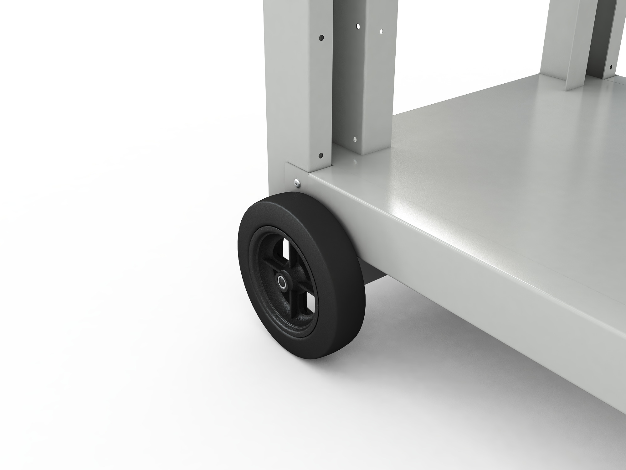 - Колеса: 2 поворотных d=100 мм со стояночным тормозом и 2 неповоротных колеса d=150 мм, выступающих за плоскость тележки, обеспечивают высокую устойчивость